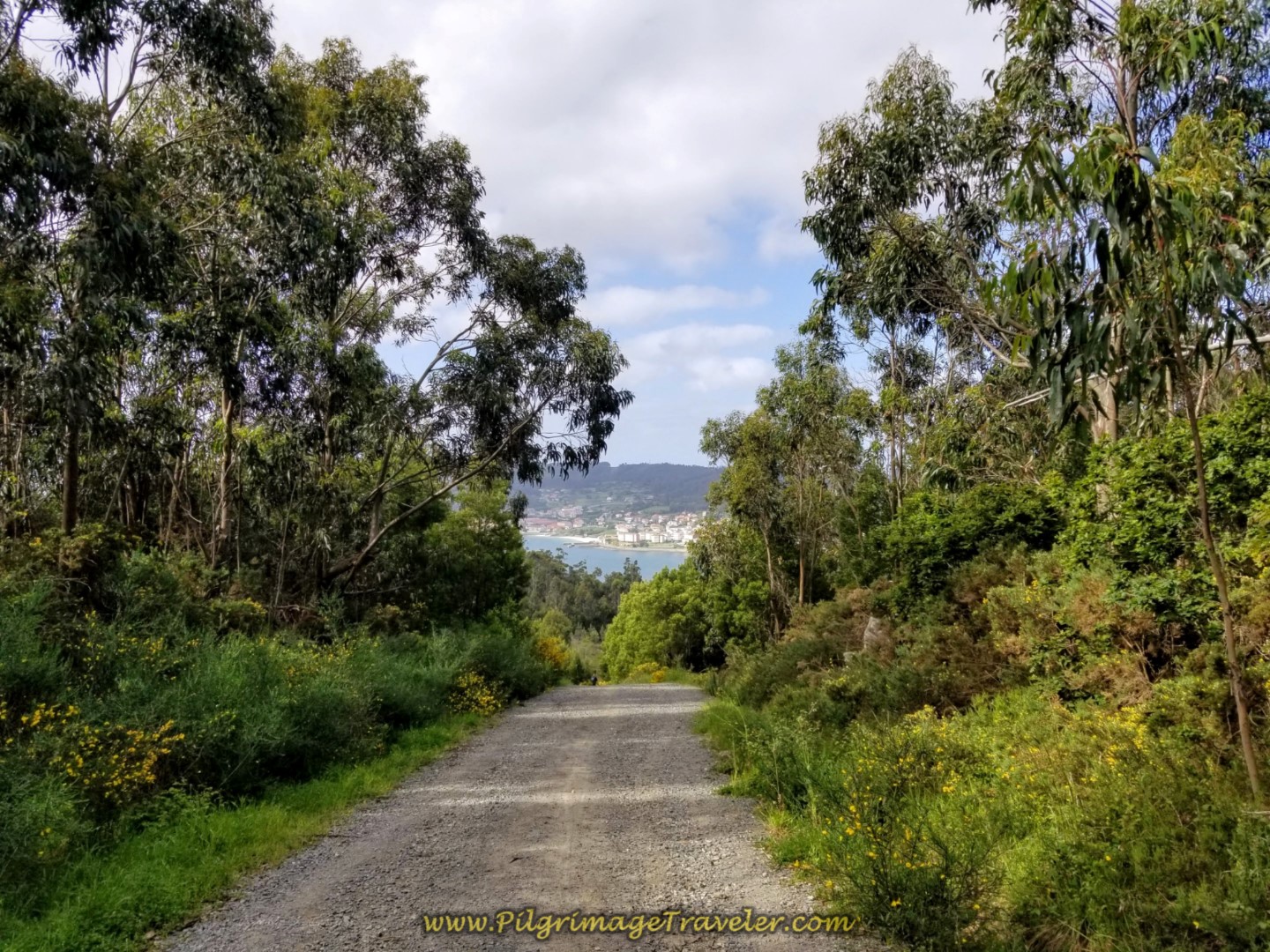 A View of Corcubión Through the TreesAfter many, many kilometers on dirt and gravel lanes, the Way drops steeply until arriving at a T-intersection in Cée. A left turn onto the pavement, brings you into the town proper, after approximately 18 kilometers total for the day.
